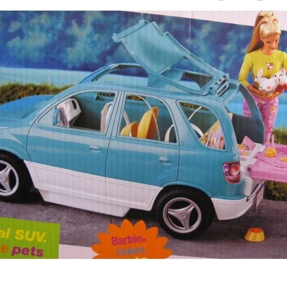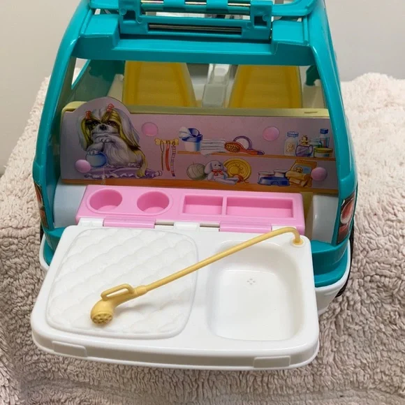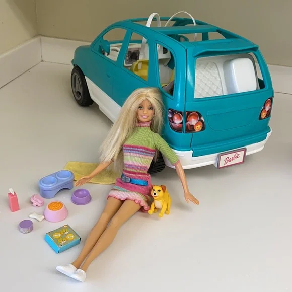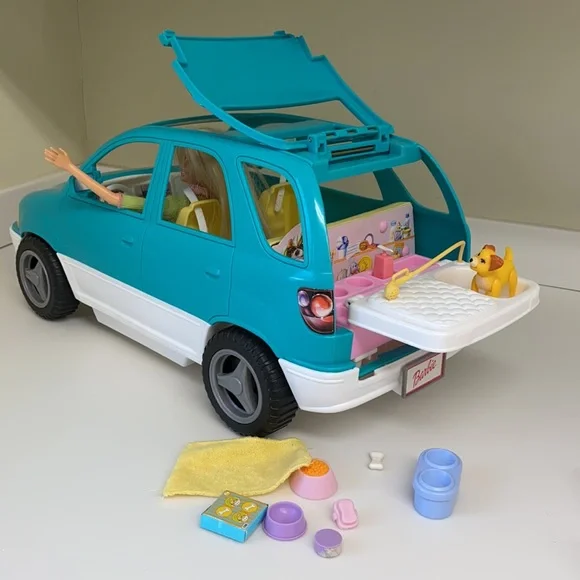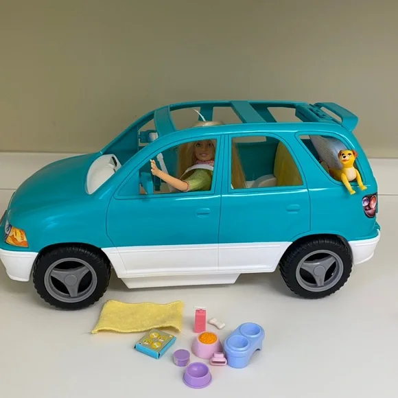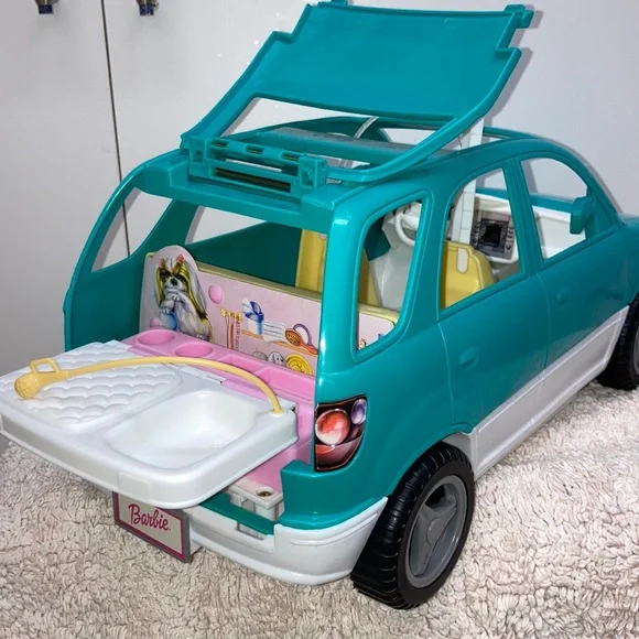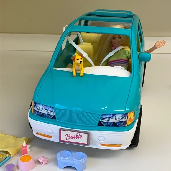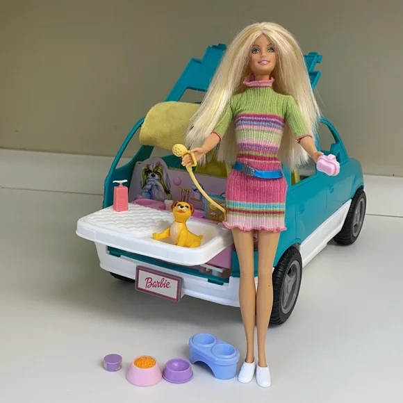 Kennel Care Mobil Zoom and Groom Vehicle and Barbie Doll and Dog with themed pieces are all included in this awesome fun bundle.The SUV has a pop out pet care station behind the backseat - rare / retired. The car really moves and had seat belts. The dog’s legs, tail, head moves. Soap container,towel, food bowels, dog bone, detergent, shoes, authentic Barbie dress are all included as imagedExcellent used Condition All authentic Barbie Mattel and quality and durability of the older Mattel toys! Doll imprint 1999, Car 2001, all probably bought in 2001Box is not include for demonstration purposes only Bundle for more savings( must fit in box and weight restrictions), offers welcomeComes from our extensive Barbie Collection see other listings Comes from a smoke free home, offers welcome